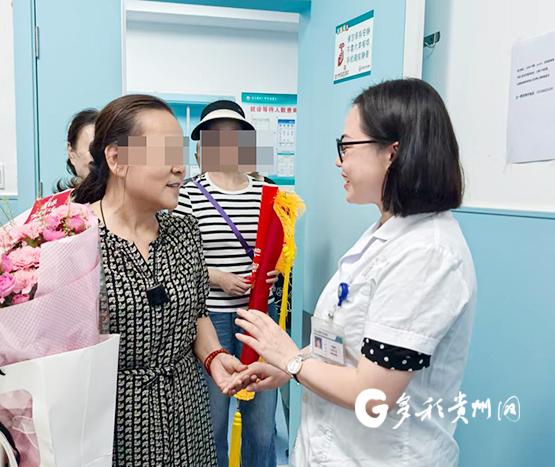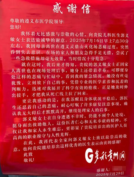 7月30日,祝阿姨带着一束鲜花和一面写有“医者仁心,危难时刻施援手;大爱无疆,悲痛之中显担当”的旌旗来到遵医附院,希望当面感谢郭医生。在医院门诊大厅,祝阿姨见到刚下门诊的郭义敏,她紧紧握住这位救命恩人的手,眼中闪烁着感激的泪光,并将鲜花和旌旗亲手交给郭医生,深情地说:“谢谢你,是你给了我第二次生命。在当时那种情况下,如果不是你勇于站出来,可能我已经不在了,我真的不知道该如何感谢你才好。”
