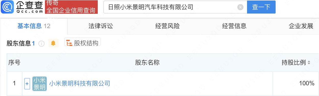 近日,日照小米景明汽车科技有限公司成立,法定代表人为崔强,注册资本100万人民币配资公司排名前十,经营范围含新能源汽车整车销售、汽车销售、智能车载设备销售、二手车经纪等。企查查股权穿透显示,该公司由小米景明科技有限公司全资持股。